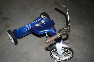 One of Douglas' coworkers is a single mom. She doesn't have tons of money but still wanted to get her 3 year old son something nice for Christmas. Her father found an old beat up rusty sort of schwinn trike in the trash and pulled it out to keep it. Doug's friend brought it to Doug to see if Doug would be able to restore the bike so she could give it as a present for Christmas. She gave him $20 for paint. Doug went to town on the bike. He stripped it, buffed it out, sanded it down, painted it and then customized it a little. Super cute. The trike turned out awesome! I snapped a couple pictures so we could remember the true meaning of gifts. Giving from the heart. Doug white walled the tires, put pin stripes on and even wrote the child's name on the back of the seat. I love it!